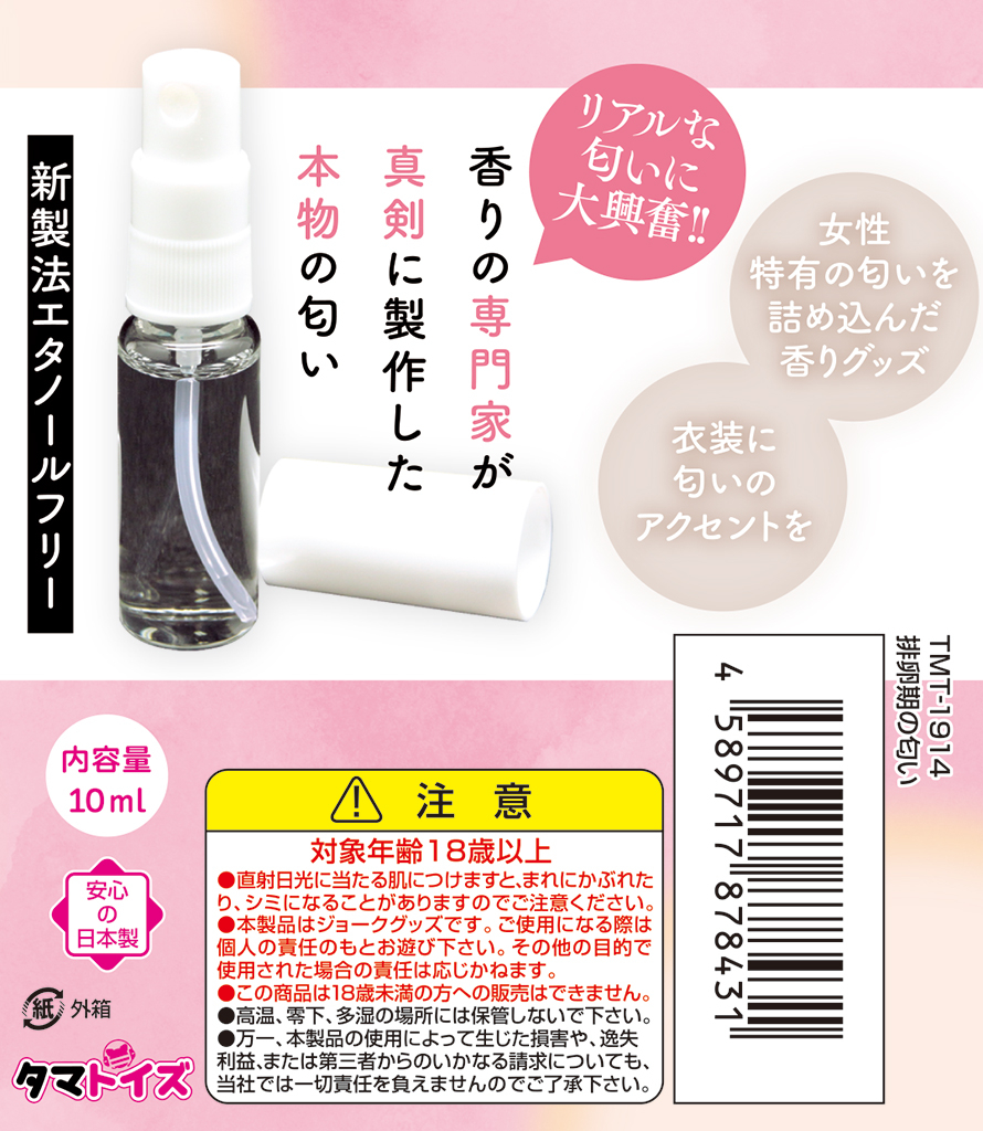 新製法エタノールフリー 今日は危険日だよ・・・ 女性の排卵期の匂いを完全再現 リアルな匂いに大興奮!! 女性が排卵期に発する男性を引き寄せる匂い 女性フェロモンたっぷりの淫臭 匂いで感じる新感覚 あのとき感じたあの匂いをもう一度 女性の特有の匂いを詰め込んだ香りグッツ 衣装に匂いのアクセントを 内容量10ml 香りの専門家が真剣に製作した本物の匂い 日本製