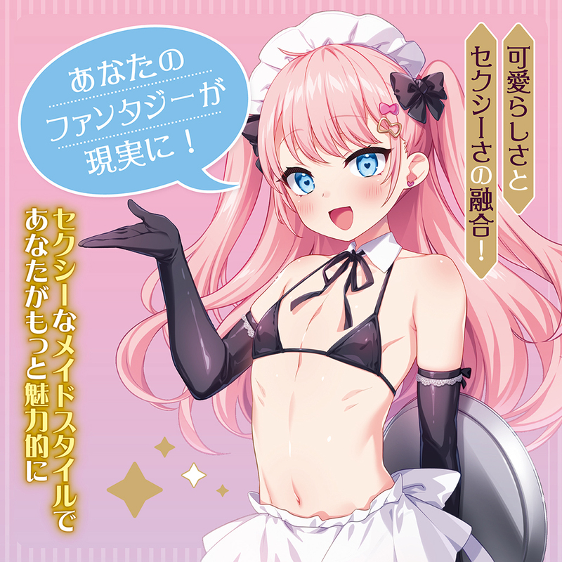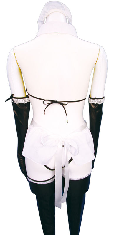 可愛らしさとセクシーさの融合! 光沢感と肌見せがセクシー セクシーなメイドスタイルであなたがもっと魅力的に メイドの可愛さにセクシーをプラス あなたのファンタジーが現実に! 7点セット カチューシャ、首かざり、ビキニブラ、ショーツ、ロンググローブ、ニーソックス、エプロン バスト 79~93cm ヒップ 87~105cm Fサイズ ポリエステル90% ポリレウレタン10% イラスト:ぺし太