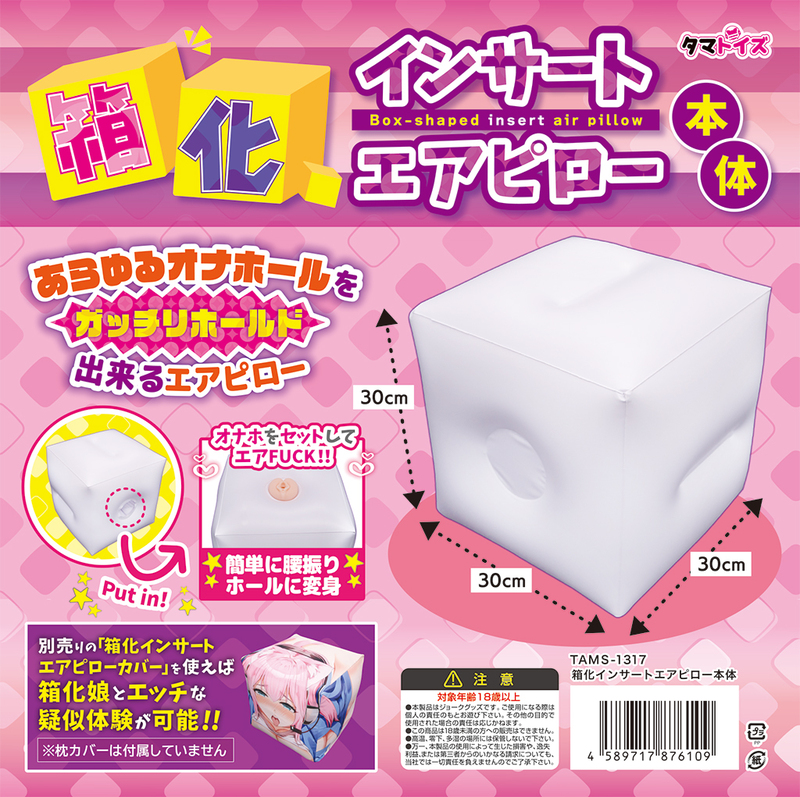簡単に腰振りホールに変身 あらゆるオナホールをガッチリホールド出来るエアピロー オナホをセットしてエアFUCK!! ※枕カバーは付属していません。 別売りの「箱化インサートエアピローカバー」を使えば箱化娘とエッチな疑似体験が可能!! サイズ:30cm×30cm×30cm(膨らませ時)
