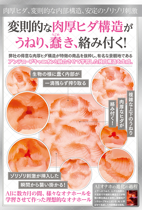 タマトイズAI 国内自社工場製 日本製 AIに数カ月の間、様々なオナホールを学習させて作った理想的なオナホール 複雑な内部構造がうねり、蠢き、絡みつく! 弾力のあるフレキシブルスキン使用 高弾力・高伸縮素材 匂い控えめ ※裏返しにすると破損の恐れがあります。 非貫通型 ローション付き