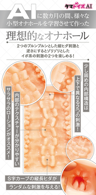 タマトイズAI AIに数カ月の間、様々な小型オナホールを学習させて作った理想的なオナホール 2つの縦長のヒダが内部でブルンブルンと裏筋を刺激して気持ち良い!2つのブルンブルンとした縦ヒダ刺激と逆さにするとゾリゾリとしたイボ系の刺激を楽しめる! 日本製 国内自社工場製 非貫通型オナホール ローション付き 全長150mm 重量260g