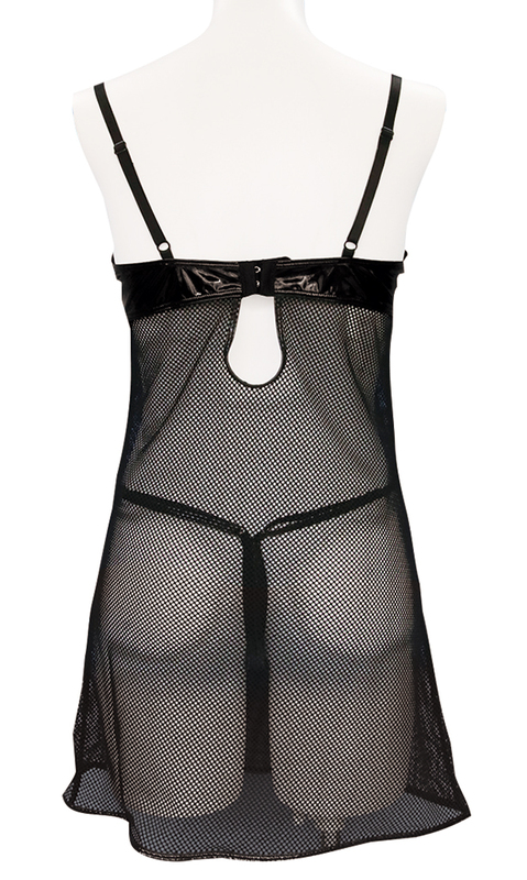 メッシュ素材&エナメル素材をコンビにしたセクシーコスチューム ハイクオリティな光沢素材使用 【FRONT】透け感がセクシーなネットワンピース 【BACK】後ろがホックで着脱可能