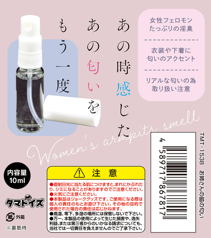 お姉さんの脇汗の匂いを完全再現 リアルな匂いに大興奮!! 匂いで感じる新感覚 あのとき感じたあの匂いをもう一度 女性フェロモンたっぷりの淫臭!! 衣装や下着に匂いのアクセントを 内容量10ml 香りの専門家が真剣に製作した本物の匂い 内容量:10ml イラスト:裏筋侍 ?裏筋侍