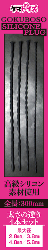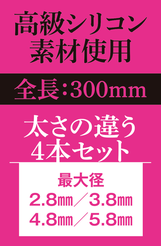 シリコンカテーテル4本セット 未体験の快感をさらなる高みへ! 高級シリコン素材使用 初心者に優しい柔らかなシリコン製 高級シリコン素材が生み出すソフトな質感 なめらかなウェーブ形状 太さの違う4本セット 全長:300mm 最大径:2.8mm、3.8mm、4.8mm、5.8mm イラスト:ヴァイス・アンネリーゼ/はかば