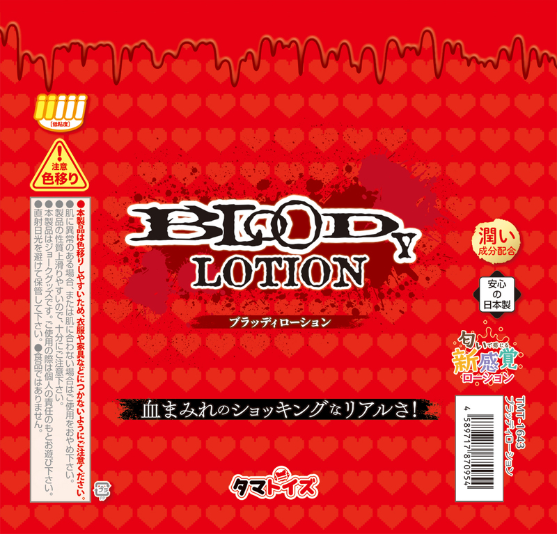 安心の日本製 天然潤い成分配合 120ml BLOODY LOTION 色移り注意! リアルな血液の色、粘度、匂いを再現! 血まみれのショッキングなリアルさ! あなたの想像力を刺激する 匂いで感じる新感覚ローション 本製品は色移りしやすいため、衣服や家具などにつかないようにご注意ください。 ●●○○○ 低粘度