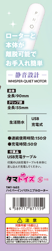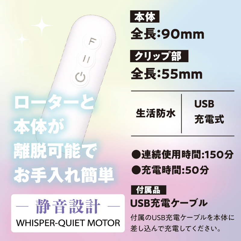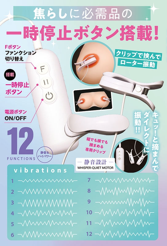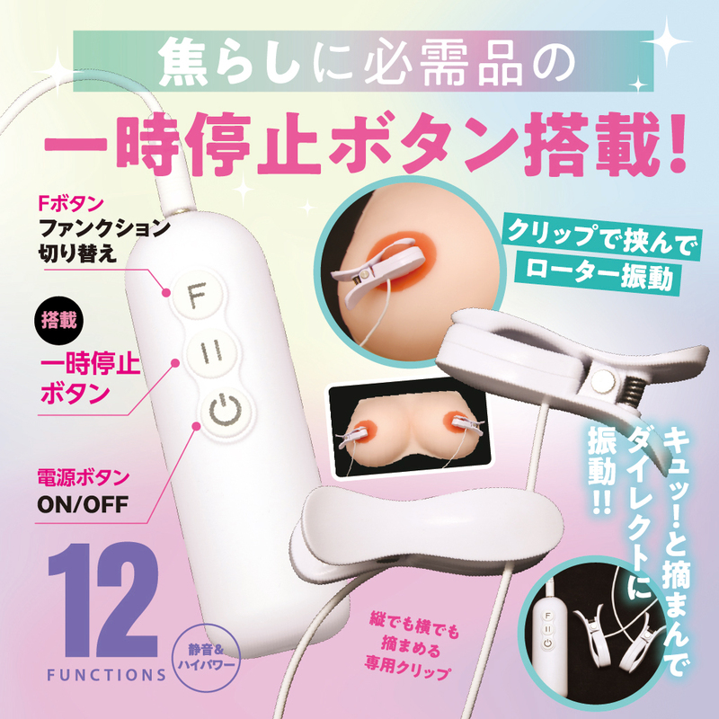 充電式ハイパワーモデル 焦らしに必需品の一時停止ボタン搭載!! 静音&ハイパワー 12パターンの振動があなたを刺激する ローターと本体が離脱可能でお手入れ簡単 クリップで挟んでローター振動 キュッ!と摘まんでダイレクトに振動!! 縦でも横でも摘まめる専用クリップ 超密着で振動をダイレクトに伝える 電源ボタン:ON/OFF Fボタン:ファンクション切り替え 一時停止ボタン搭載 静音設計 生活防水 USB充電式 【本体】全長:90mm 【クリップ部】全長:55mm 付属品 USB充電ケーブル 充電時間 50分