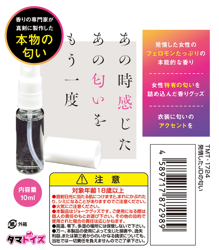新製法エタノールフリー スプレーアトマイザー 内容量10ml 発情した女子大生のメスの匂いを完全再現 リアルな匂いに大興奮!! スイッチの入ったJDが発するエロい匂い 発情した女性のフェロモンたっぷりの本能的香り 匂いで感じる新感覚 あのとき感じたあの匂いをもう一度 女性の特有の匂いを詰め込んだ香りグッズ 衣装に匂いのアクセントを