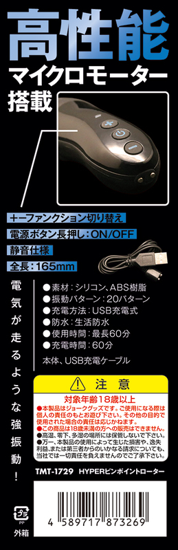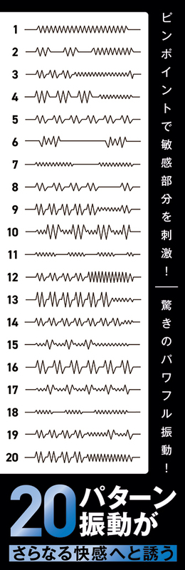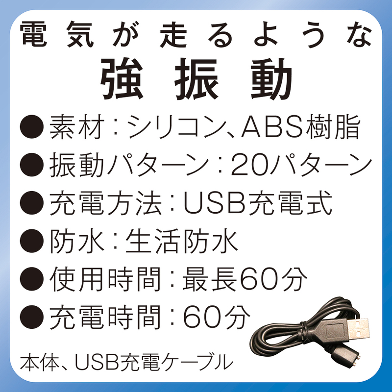 高性能マイクロモーター搭載 20パターン振動がさらなる快感へと誘う 高級シリコン素材使用 高級シリコン素材が生み出すソフトな質感 ピンポイントで敏感部分を刺激! 驚きのパワフル振動! 電気が走るような強振動! 全長:165mm 電源ボタン長押し:ON/OFF +-ファンクション切り替え 静音仕様 ●素材: シリコン,ABS樹脂 ●振動パターン:20パターン ●充電方法: USB充電式 ●防水: 生活防水 ●使用時間:最長60分 ●充電時間:60分 本体、USB充電ケーブル