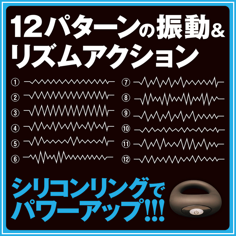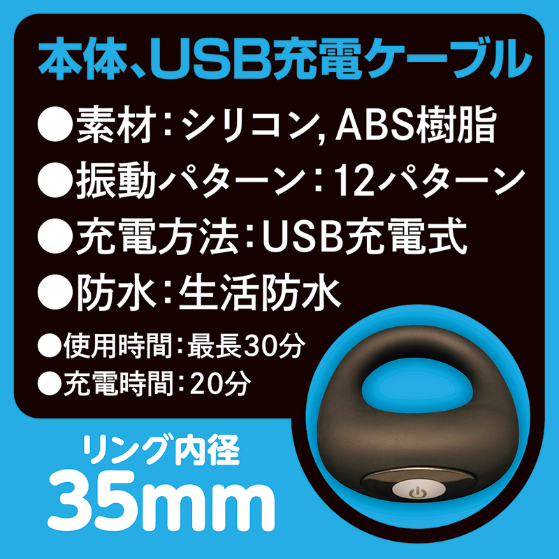シリコンリングでパワーアップ!!! 12パターンの振動&リズムアクション フィット感抜群の肉厚シリコン 肌に優しく自然の感触 伸縮性抜群! 高品質シリコンの滑らかな肌触り 柔らかく伸縮性の高い最高級シリコンを使用 シリコン素材が適度な締め付けを実現 ぴったりフィット リング内径:35mm ●素材: シリコン,ABS樹脂 ●振動パターン:12パターン ●充電方法: USB充電式 ●防水: 生活防水 ●使用時間:最長30分 ●充電時間:20分 本体、USB充電ケーブル