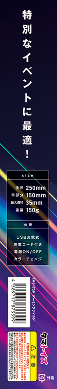 気分も上がるペンライト型ディルド 虹色に光るゲーミングタイプ 映える7COLOR 特別なイベントに最適! ソフトでリアルな触感!! 無理なくスムーズなストレートデザイン 柔らかな肌触りと満足の弾力を再現 握りやすいくびれグリップRED ORANGE YELLOW GREEN LIGHT BLUE BLUE PASTEL BLUE 【本体】 重量:150g 全長250mm 竿部分150mm 最大直径35mm USB充電式 充電コード付き 電源ON/OFF カラーチェンジ ●充電方法: USB充電式 ●使用時