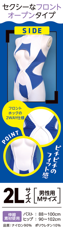 セクシーなフロントオープンタイプ フロントホックの2WAY仕様 ホワイト×ブールのスポーティなデザイン ツルツルした感触がたまらない! ピチピチのフィット感 最高の着心地が体験できる 伸縮性抜群! 2Lサイズ(男性用Mサイズ) 伸縮素材使用 バスト 88~100cm ヒップ 90~102cm 品質:ナイロン90% ポリウレタン10%