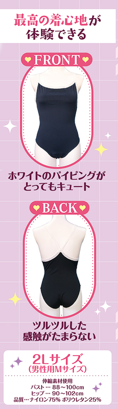 2Lサイズ 股間のワレメカップが綺麗な一本筋を再現 正統派紺色スクール水着タイプ ホワイトのパイピングがとってもキュート ツルツルした感触がたまらない ピチピチのフィット感 最高の着心地が体験できる 伸縮性抜群! 2Lサイズ(男性用Mサイズ) 伸縮素材使用 バスト 88~100cm ヒップ 90~102cm 品質:ナイロン75% ポリウレタン25%