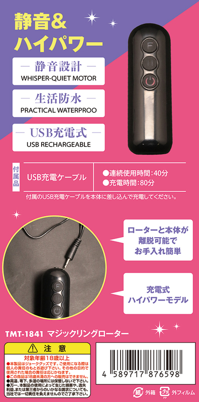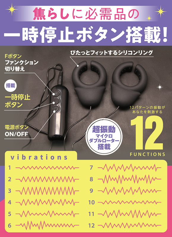 二つのリングが敏感部分を挟み込む 充電式ハイパワーモデル 焦らしに必需品の一時停止ボタン搭載!! 静音&ハイパワー 12パターンの振動があなたを刺激する ローターの振動がダイレクトに伝わる ローターと本体が離脱可能でお手入れ簡単 予想できない振動パターンが予期できない快感へ誘う!! 超振動マイクロダブルローター搭載 ぴたっとフィットするシリコンリング 超密着で振動をダイレクトに伝える 電源ボタン:ON/OFF Fボタン:ファンクション切り替え 一時停止ボタン搭載 静音設計 生活防水 USB充電式 付属品