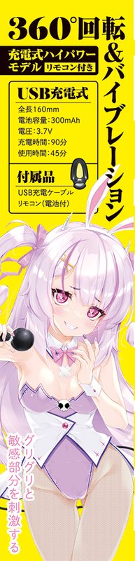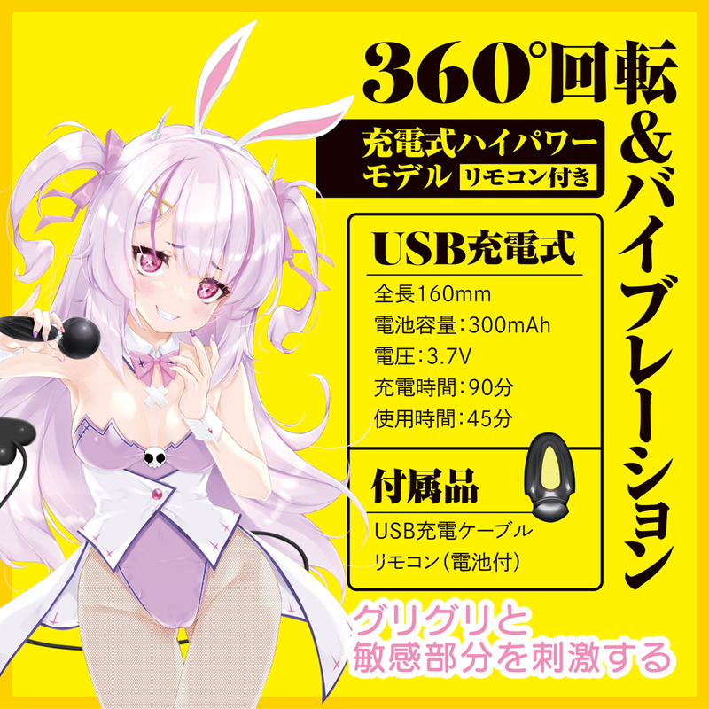 充電式ハイパワーモデル リモコン付き 強力バイブレーションと回転で強烈オルガ発動! 7パターンの振動と回転パターン 上質なシリコンが最高の挿入感を演出 適度な太さが充実感のある刺激を リモコンで焦らしプレイもOK グリグリと敏感部分を刺激する 手元で楽々リモコン付き 静音設計 生活防水 USB充電式 全長160mm 電池容量:300mAh 電圧:3.7V 充電時間:90分 使用時間:45分 付属品 USB充電ケーブル リモコン(電池付:CR2032 ) イラスト:夢伽りあん/雪乃ん