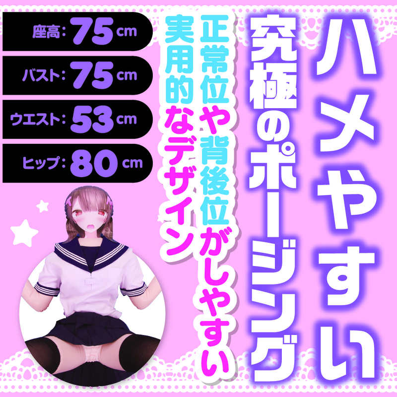 アニメチックな彼女召し上がれ? 抱きしめたくなるキューティーBODY 萌え系エアドールの決定版! 可愛らしい2次元プリントエアドール 抱き心地抜群! 女の子らしい曲線美を再現 女性用Mサイズの衣装が着用可能 好きな衣装を着せて楽しめる ハメやすい究極のポージング 正常位や背後位がしやすい実用的なデザイン 小型ホールから中型ホールまでほとんどのオナホールが装着可能 座高:75cm バスト:75cm ウエスト:53cm ヒップ:80cm イラスト:大嘘 *衣装は付属しておりません。 姫乃もも ヒメノ モモ 属