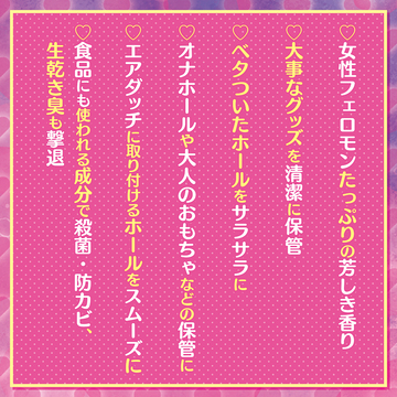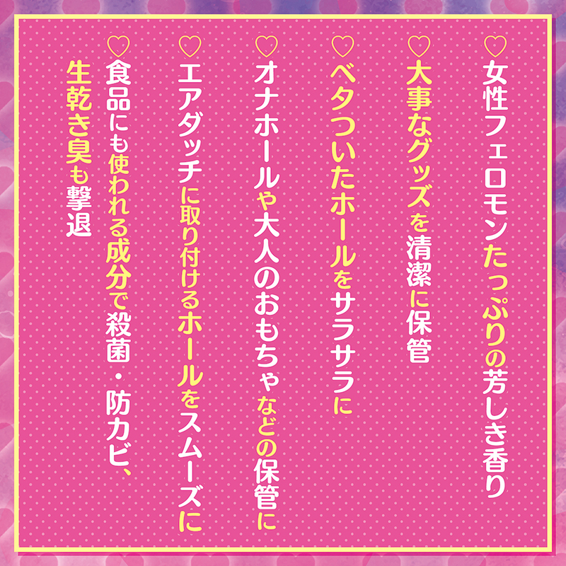 オナホール保存用パウダー 発情した女性の匂いを再現! 内容量:100g 殺菌 抗カビ ホールケアに最適 使い終わったホールの洗浄後にひと振りすると、その微粒子が素材に馴染んで表面がサラサラに変わります。また余分な油分を吸収して、サラサラの状態を保つ効果があります。 適量を簡単にまぶせるボトルタイプ ●女性フェロモンたっぷりの芳しき香り ●大事なグッツを清潔に保管 ●ベタついたオナホをサラサラに ●オナホールや大人のおもちゃなどの保管に ●エアダッチに取り付けるホールをスムーズに ●食品にも使われる成分で殺